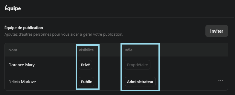 Now, maybe you noticed that team members have roles as well as a level of visibility for the publication (private or public). You want to set the publication visibility to “private” on your former account, and to “public” on your new account.